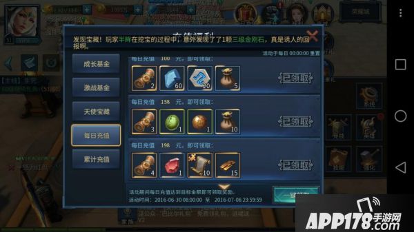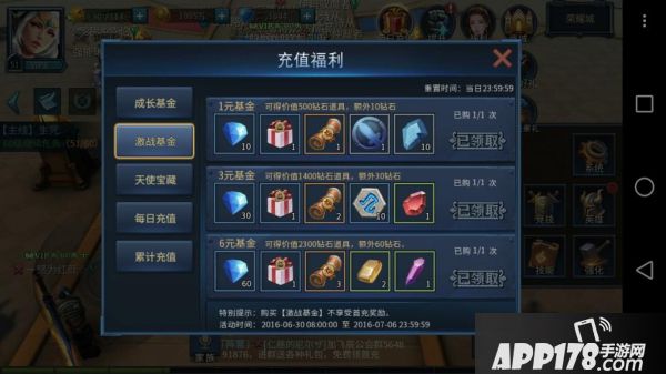 这个也是必须买的,但是推荐大家第二天购买,因为每天都有充值活动奖励,第一天买了3卡后就领了大部分了,所以成长基金可以留到第二天购买。奖励很好,这游戏2天就50级。198块,一共是9980钻,到了第2天就可以拿到5480钻。