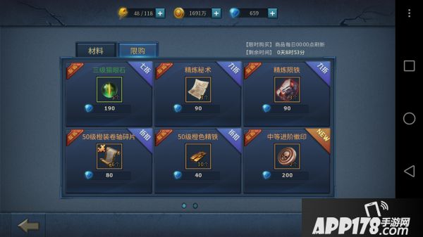 精炼秘术\陨铁 推荐指数:★★★★★ 推荐理由:这2种目前的需求是特别大的。而且获取也比较少,除了商场就是七罪副本,还有竞技场可以兑换。前期如果想弄装备的,这个是必买的。每天540钻,一般玩家都可以接受。随着装备等级的提高,会发现精炼石足够但是精铁还真不够。 50级橙装碎片50级精铁 推荐指数:★★★★ 推荐理由:每天的野外BOSS是8次有效,也就是你每天可以获得至少8个碎片跟8个铁。一件装备需要30个铁,如果没有消费活动送的,这个装备进阶还是需要一段时间的。 某个部位的装备首次获得橙装还有对应的限购礼包,价格是2998,里面有1个5级宝石跟材料若干。如果是想弄新装备,建议先攒够买礼包的再合装备。这样更划算。 中级进阶徽章 推荐指数:★★★★★ 推荐理由:对于用白法师的人来说这个必买的,不然技能无法升级。黑法师虽然无需这个道具,但是后期肯定是2个职业都要修的,所以迟早也要买~ 橙色经验卷轴 推荐指数:★★★ 推荐理由:这个在初级不是非常缺,原因是激战礼包送这个。然后家族篝火也有紫色卷轴,各种充值活动橙色经验卷送的比较多,但是如果你是大V,每天的经验卷轴使用次数多,发现哪天橙色卷轴不够的时候就买吧。