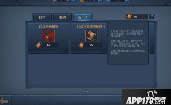角斗场每次开启1个小时,每人共有30次机会,角逐可获得积分,所获得的积分最高者获得“战神”称号,参与角逐还可以获得角斗场勋章,胜利得15个,失败得4个,得到的勋章可以在商城兑换60级装备碎片和铁。