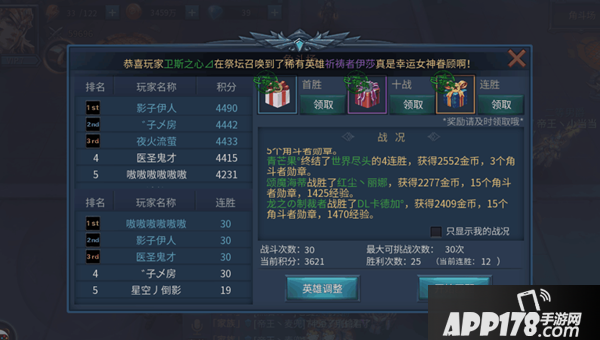 2.角斗奖励礼包有首胜礼包、十战礼包和十连胜礼包,所以大家尽量获得十次连胜拿满所有礼包。