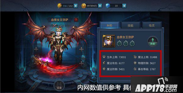 从图中可以看出,血祭女王弥萨拥有超高的基础三围属性,绝对是各位勇士角逐竞技场以及角斗场必不可少的神将(图中为内网79级英雄裸装属性,具体属性还请大家以游戏内为准)。