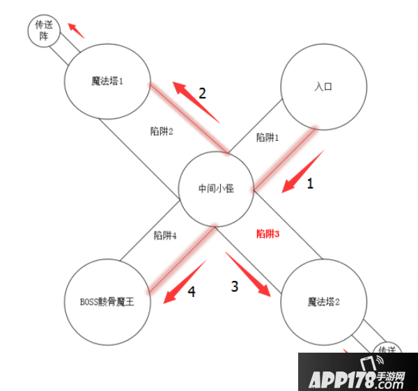 图中箭头表示各位勇士进军的方向,箭头旁的数字表示进军的顺序,需要特别说明的是过道标红的一侧为安全通道(即从红色一侧通过过道是不会被陷阱打到的)。从图中可以看到陷阱1、2、4都有安全通道,而陷阱3是没有安全通道的,因此各位勇士通过陷阱3的时候一定要用位移技能缓慢度过哦~