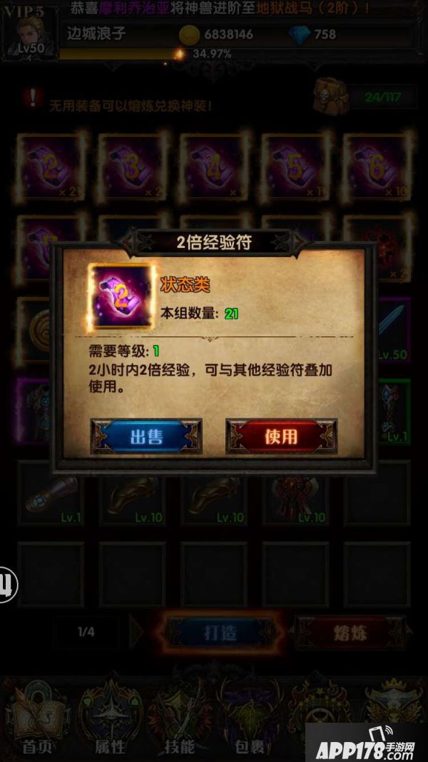第四步:打开包裹,看到了自己拥有的多种倍数经验符,还等什么,马上走起!