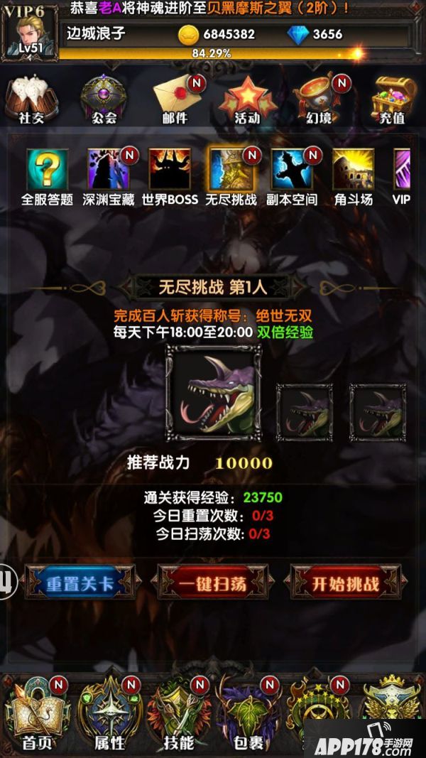 游戏中提供了一个刷经验的利器,就是无尽挑战,玩家每完成一次挑战都会获得大量经验值奖励,如果能完成百人斩更能获得绝世无双的霸气称号!为了方便用户,游戏还提供了一键扫荡的快捷功能,真是友爱啊,注意提示,每天18:00-20:00这个时间段来挑战更有双倍经验哦!