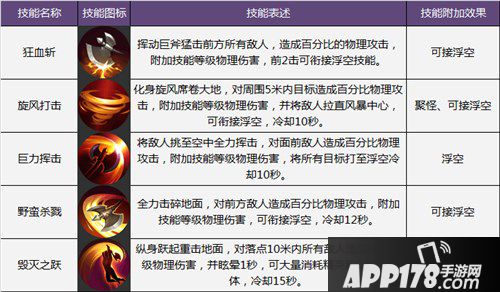 优点-力量型战士,防御力极强,挥动双斧可在深入敌人中心进行斩杀。操作简单很容易上手,并且技能的配合使用很容易的将敌人连技到死,很是凶残。