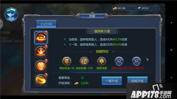 【主动技能】随等级提高可以学习更高等级技能,技能等级越高,伤害越高。技能每提升10级开启一个技能印符,每个等级的技能印符附加效果不同,如伤害附加,减伤,buff持续时间增长等。主动技能升级需要消耗金币。