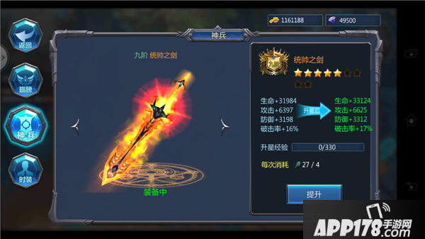 2、 神兵进阶时,使用“神兵进阶石”可以获得进阶经验,升星经验值提升满后,即可达到下一阶(星级),进阶过程中提升经验值有几率出现多倍暴击效果,获得大量经验。