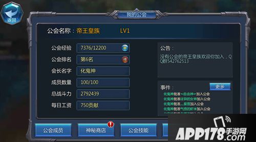 我们首先来看看公会的面板,面板主要有四个元素:公会成员、神秘商店、公会技能、战利品。