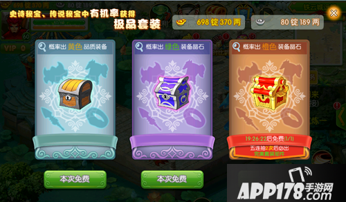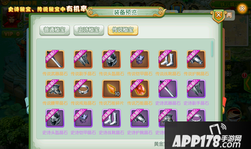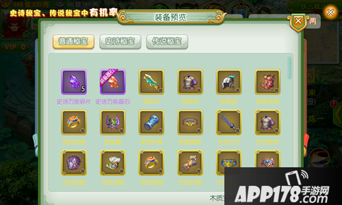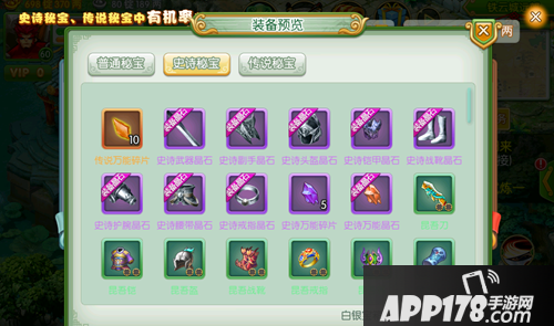 普通秘宝,能够获得从白色到黄色品阶的装备。还有一定的几率获得史诗万能碎片和晶石,当然这个几率自然可以说和中彩票差不多。每一次抽取需要消耗我们15两,每天有10次的免费抽取机会。