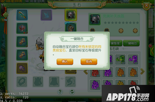 合成玩法更为快捷,首先点击一键融合,然后选取目标宝石,系统会自动融合背包内所有同类别同等级宝石,直至目标宝石等级提升。