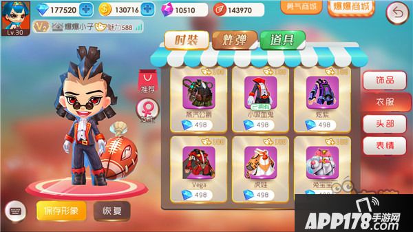 《爆爆堂》的时装系统包括帽子、眼镜、表情、衣服,甚至是炸弹,可以从头装扮到脚,种类太多,挑选的时候小心眼花缭乱。