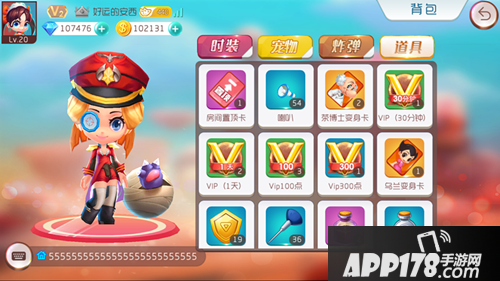 背包中分为“时装”、“炸弹”和“道具”三个模块:“时装”中放置了玩家目前拥有的各类衣服、头部、表情和饰品;“炸弹”中放置了玩家拥有的炸弹皮肤;“道具”中放置了玩家拥有的战斗内和战斗外使用的各类消耗道具。