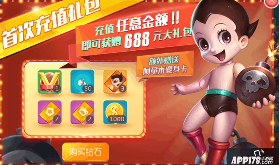 唯一遗憾的是,虽然熊本熊的变身卡和炸弹造型登录游戏就可以得到,但阿童木却需要首冲呢。不过游戏形象不影响角色能力,免费玩家选择不购买变身卡,依然可以尽情享受游戏。