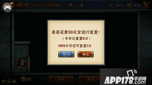 愈是上楼,BOSS的难度越高,守卫的防守越重,终会有个时刻,你臣服于守卫脚下再不能向前,这个时候重置镇妖塔就可以返回镇妖塔第一层。重置以后,就可以使用扫荡功能直接上到你停下的楼层了。扫荡获得的奖励一样也不会少,所以放心大胆的扫荡吧。当然镇妖塔每日只可免费重置一次,再重置就要花费元宝了。VIP等级越高,可以花费元宝重置镇妖塔的次数也越高哦。