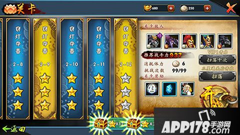 关卡三星通关以后即解锁本关卡扫荡功能。VIP1以上玩家更有扫荡十次的功能。主线副本的主要掉落装备碎片、元神碎片、强化石和魔法石都是战力养成的关键稀缺材料,玩家每日从游戏中可以获得的都是有上限的,所以每日的体力不要浪费,记得通过扫荡消耗掉。另外,每一个小节独有的装备碎片或元神碎片产出,或许你包裹中的小白龙元神只差两个就可以召唤星辰之力提升属性了,此时打开精英副本第2章“窃灯夺香”第3节,扫荡几下许就齐了呢。当然,每个小节的扫荡都有次数上限。精英关卡的挑战次数只有3次,不要浪费也不要太贪心哦。
