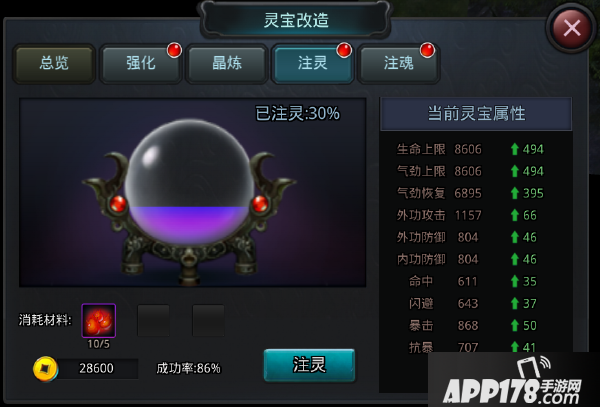 消耗相应材料可以对灵宝进行注魂,与注灵类似,注魂程度越高,灵宝加成的属性也越高。不同的是注魂是按百分比提升灵宝的属性。