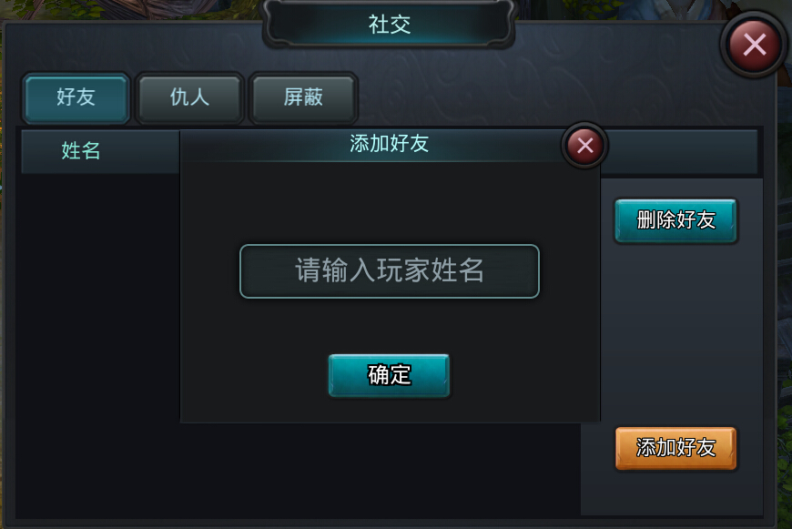 游戏内玩家可以互相添加好友,可以通过添加名字的方式将其他玩家加入好友列表。