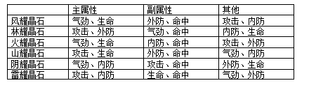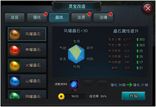 消耗晶石可以对灵宝进行晶炼操作,灵宝有6种可供晶炼的晶石,每种晶石有不同的属性加成倾向。
