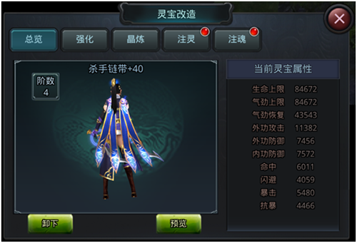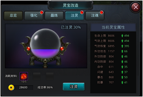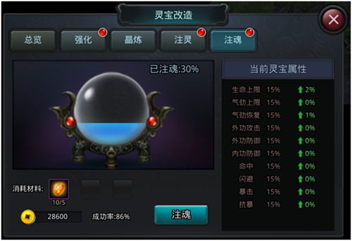 消耗相应材料可以对灵宝进行注魂,与注灵类似,注魂程度越高,灵宝加成的属性也越高。不同的是注魂是按百分比提升灵宝的属性。