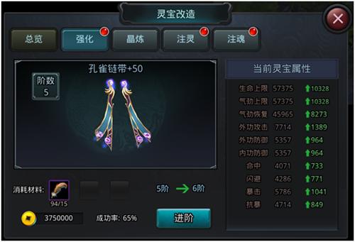 消耗相应的强化材料以及银两,有一定的概率提升灵宝等级,灵宝等级提高,加成的属性也会随之提高