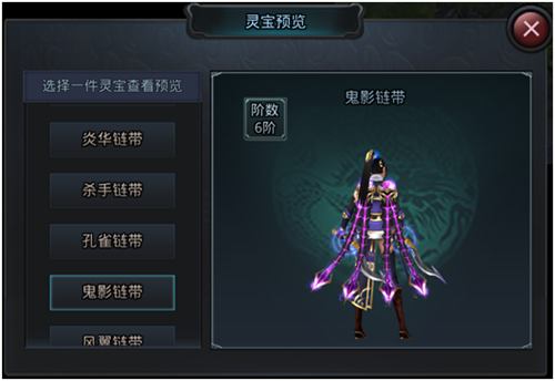 在总览界面中点击预览,可以查看各阶层的灵宝外观。