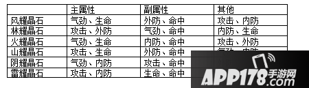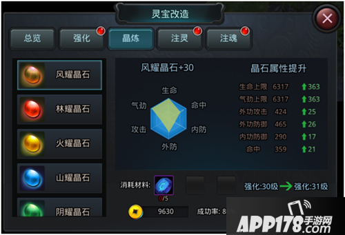 消耗晶石可以对灵宝进行晶炼操作,灵宝有6种可供晶炼的晶石,每种晶石有不同的属性加成倾向。