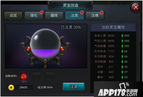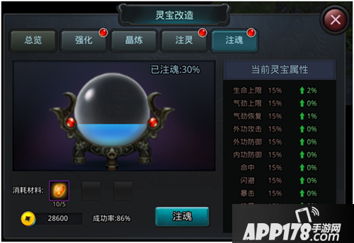 消耗相应材料可以对灵宝进行注魂,与注灵类似,注魂程度越高,灵宝加成的属性也越高。不同的是注魂是按百分比提升灵宝的属性。