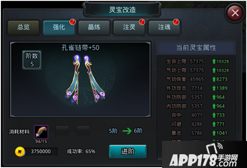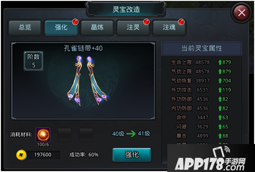 消耗相应的强化材料以及银两,有一定的概率提升灵宝等级,灵宝等级提高,加成的属性也会随之提高