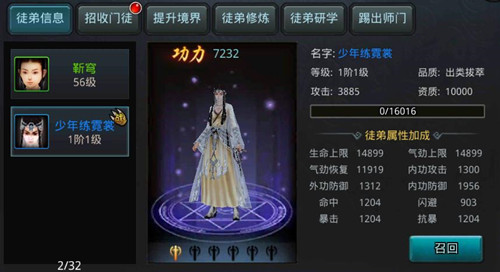 战斗无药品补充,特有的气劲系统,就是在人物红色血条上方的黄色血条,有点像护体真气、无极护盾一样,只有打破这个之后才会掉血。灵宝:相当于背饰,强化进阶后会改变外形,变得更加酷炫,还会发出耀眼的光芒,高手的背影一看便知。徒弟:身边的小跟班,可以帮助进行战斗,这必须得抽个橙色神品的萌妹子啊,想想晚上都有点小激动呢。