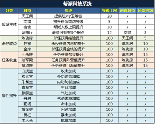 不单单是是帮派线的科技研究,另外还涉及到杀怪收益,任务收益,以及人物属性提升先;突出了“帮派科技”一个丰富性的玩法设定;帮派科技的指向很明确,可玩性较高。