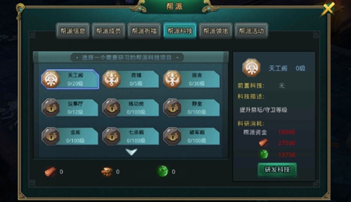 帮派科技研发需要消耗的材料是:资金,木材,石材,玉石