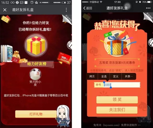 5月到6月期间,《白发魔女传》手游携手京东推出“免费送百万京东代金券” 大型专题活动,活动通过创意H5传播,向玩家免费发送京东20万代金劵、5台iPhone6S、《白发魔女传》周边扇子,福利活动迅速在朋友圈传播起来,火爆朋友圈。