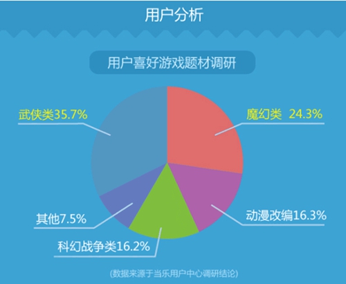 2016年,武林风起云涌,各种题材也被不断开发,推出新的大作。江湖和武侠对于国人来说有着特殊的意义,用户喜爱的游戏题材调研结果显示:武侠题材占比在4成左右,武侠题材一直是备受玩家青睐。