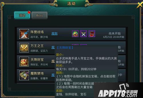 每天19:00开启,每次持续20分钟,活动时间内在地图内随机刷新宝箱,点击宝箱即可获得大量奖励