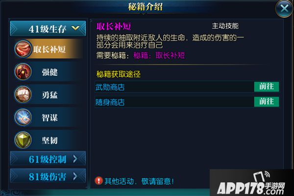 儒士的41级生存系秘籍技能是取长补短,可以抽取附近敌人的生命用来治疗自己。