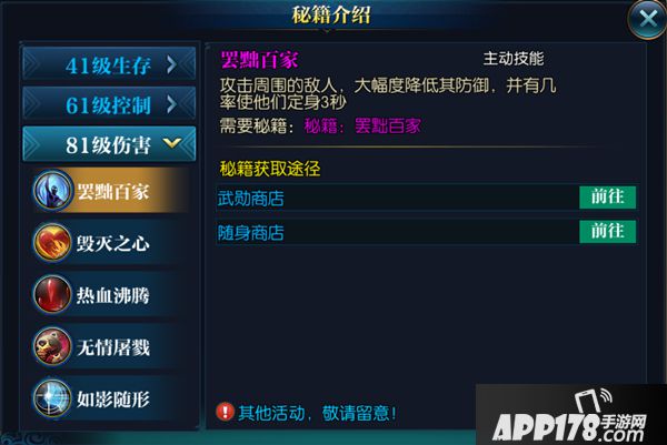 儒士的81级伤害系秘籍技能是罢黜百家,攻击周围敌人,大幅度降低其防御,并有几率使他们定身3秒。