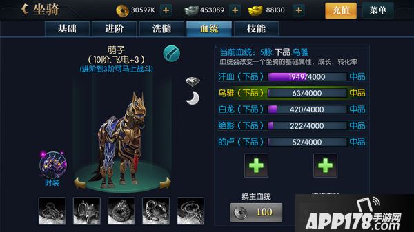 一匹坐骑良好与否,血统占据了很大一部分,历史上吕布的赤兔,黄忠的爪黄飞电,无一不是万中挑一的极品宝马,在游戏中,将军们也能获得极品好马。可以在每日副本获得不同的宝马血统丹,也可以在商城购买随机溶血丹,达到数值之后就可以提升品级了,血统品级越高,获得的属性越强。
