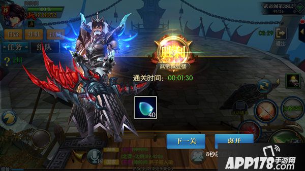 各位将军进入地图后,就可以参加战斗,将小怪全部消灭吧,关卡胜利以后就能获得各种物品了。胜利以后会有两个选项供将军选择,可以继续参加战斗,也可以退出提升实力之后再来参加战斗,不过将军要注意,10秒钟会自动进入下一关。