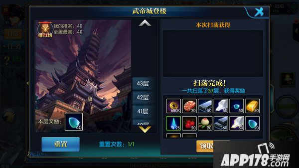 每天系统会有一次重置活动的机会,重置以后将军可以选择自己挑战,或者选择扫荡功能,扫荡会自动扫荡到将军攻克关卡最高的一层,不同的楼层需要消耗不同的时间,也可以使用加速扫荡功能,加速扫荡会消耗将军一定数量的金元宝。