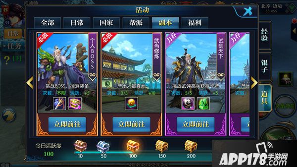 活动界面,副本,道具选项以后向右滑动就可以看见武当修炼副本了。