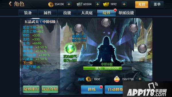 下面再说境界系统,境界需要将军有足够的感悟值,感悟值用来修炼获得修为,修为满了之后会提升一个小境界,小境界达到10级需要破障丹进行突破,突破之后可以继续修炼,每一个大境界有低级,中阶,高阶,巅峰,圆满5个小境界,每突破一次,都会为将军带来大量属性和战斗力的加成。