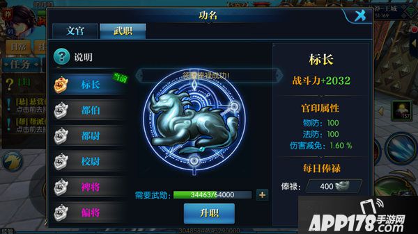接下来推荐功名系统,功名分文官和武职两种,官位越高,战斗力加成越高。文官升级需要名望,名望的获取将军需要进行每日答题活动,答对的题目越多,获得的名望越多,名望达到升级要求就可以进行升级了。武职的升级需要武勋,武勋可以通过每日竞技场或者击杀敌国玩家获取,同样,武勋达到升级要求便可进行升级,官职系统每日还会提供将军俸禄。