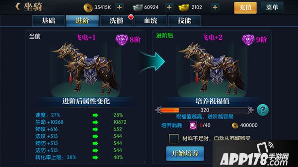 接下来推荐坐骑系统,坐骑可以进行升阶,升阶需要消耗一定数量的坐骑进阶丹,商城有出售,在进阶的时候,将军可以选择自动购买坐骑进阶丹,坐骑进阶不但为将军提供属性加成,还会解锁新的形象,坐骑阶数越高。