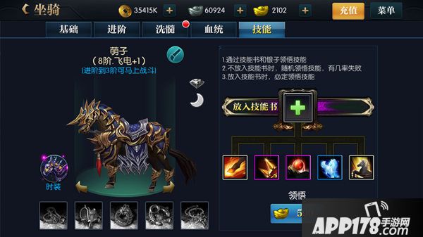 最后就是坐骑技能,技能有直接为加成和加成到坐骑两种,坐骑技能的品质越高加成也越高,将军可以尝试刷新坐骑技能来获得更好的品质加成。