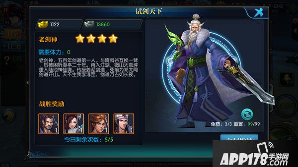 活动会有一个星级奖励,不同的星级对应不同品质的卡牌,一星最低,五星最高,要是将军不满意本次副本星级,可以选择右下角刷新选项,每天有3次免费使用的机会,3次用完以后,会收取少许银元宝作为刷新费用。刷新到将军满意的星级就快快挑战吧。