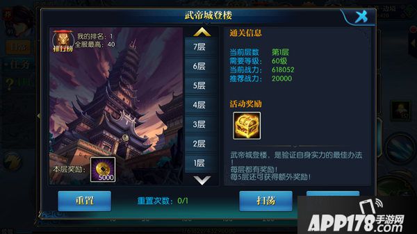 每天系统会有一次重置活动的机会,重置以后将军可以选择自己挑战,或者选择扫荡功能,扫荡会自动扫荡到将军攻克关卡最高的一层,不同的楼层需要消耗不同的时间,也可以使用加速扫荡功能,加速扫荡会消耗将军一定数量的金元宝。
