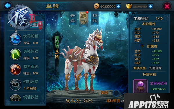 1、坐骑进阶:在坐骑达到10级之后将开启坐骑进阶功能,坐骑进阶所需要的材料为坐骑突破丹和铜币,坐骑会在进阶之后获取额外的大量属性加成,并且外观也会发生变化,同时开启其他的坐骑技能(每过10级可以进阶一次,每次的进阶外形都会产生变化,同时解锁更强大的坐骑技能)