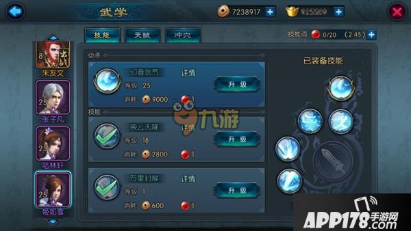 3、技能升级:在游戏中,技能的等级提升需要消耗铜币以及技能点,技能点满值为20点,消耗后可跟随时间流逝而恢复。并且,技能的等级受到角色等级的限制(如:角色等级为x级,则技能等级只能升到x级)。
