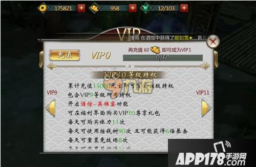 累计充值15000元宝可以达到VIP10,开启酒馆——英雄宴功能