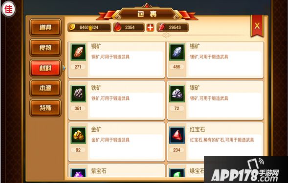 普通矿石:铜矿、锡矿、铁矿、银矿、金矿;优质宝石:红宝石、绿宝石、紫宝石、黄宝石;